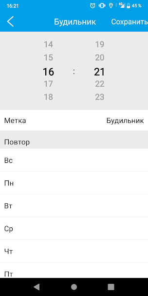 | Выберите необходимое время, измените название будильника (удалите название будильник и впишите своё название), выберите дни недели необходимые для повтора и нажмите сохранить | ![]() |